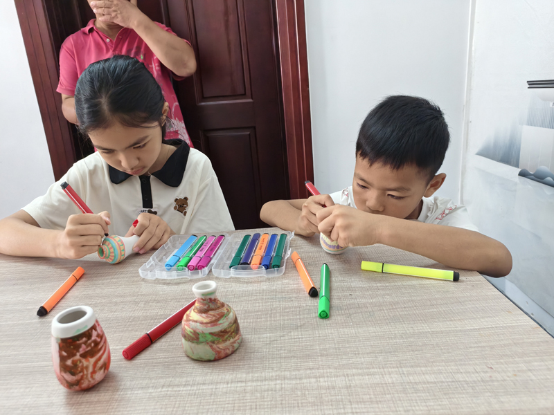 最后是超受欢迎的漆瓶手工环节!拿起画笔,孩子们在素净的漆瓶上尽情创作鼎冠策略资,有的勾勒出美丽的花纹,还有的写上了刚学会的汉字;撒下颜料,素静的漆瓶染上缤纷的色彩,一个个独一无二的漆瓶诞生了。每一个都是孩子们想象力的结晶。