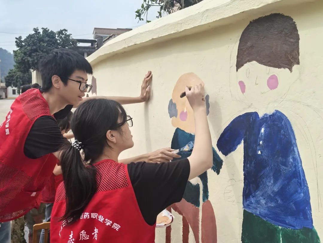 (领队老师在高墙上绘制)虽有困难险阻,但我们的青年突击队总是迎难而上。每一位成员都怀揣着敬老孝老的心情和对美好家园的憧憬,把美丽乡村和传统美德充分结合起来,用灵动画笔和缤纷色彩创作出一幅幅真挚动人的画卷。