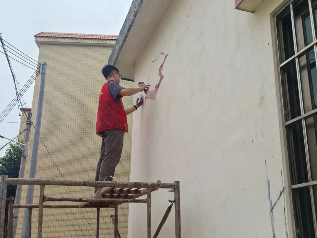 与以往的墙绘活动截然不同,这次的活动位置给志愿者们带来了不少考验。他们不仅要面临“秋老虎”的炽热和蚊虫的干扰,还要借助各种工具跨越水沟,才能顺利作画。更有一些墙面,是需要“登高”完成!